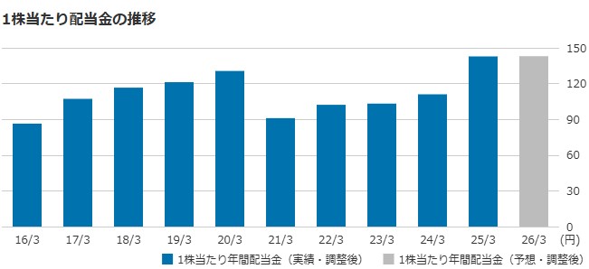 | 1株当たり配当金(会社予想) | 143.00円(2026/03) |
